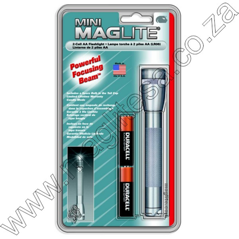 Pewter 2 AA Cell Mini Maglite in a hang pack with 2 AA batteries. High intensity light beam- with a range of approximately 150m. The torch has a continuous battery life of approximately 6 hours. High strength aluminium alloy case which is o-ringed sealed for water resistance. Spare lamp secured in the tail cap. 14.6cm in Length- 107.16g in weight with batteries. Limited life time warranty. Made in the USA.