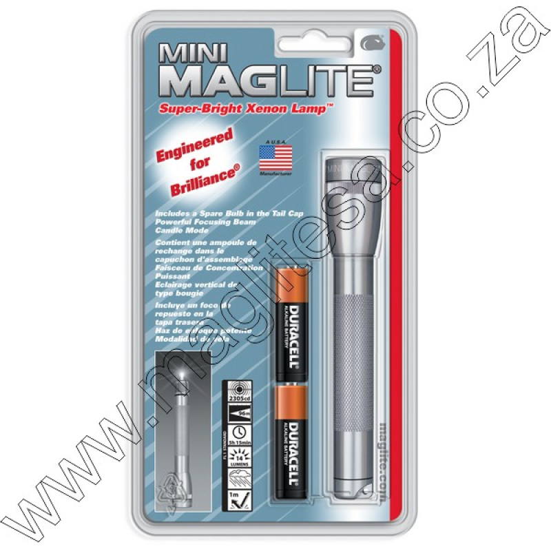 Silver 2 AA Cell Mini Maglite in a hang pack with 2 AA batteries. High intensity light beam- with a range of approximately 150m. The torch has a continuous battery life of approximately 6 hours. High strength aluminium alloy case which is o-ringed sealed for water resistance. Spare lamp secured in the tail cap. 14.6cm in Length- 107.16g in weight with batteries. Limited life time warranty. Made in the USA.